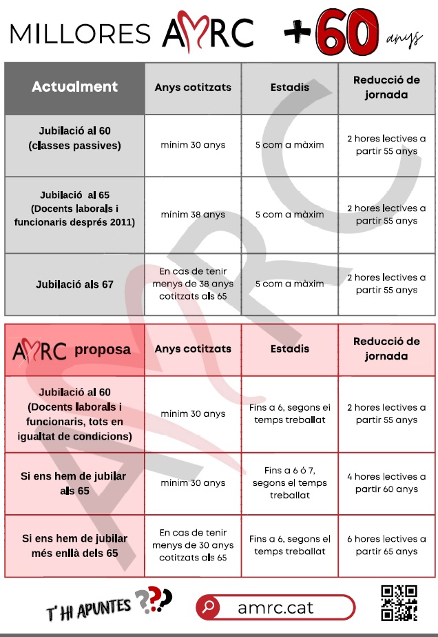 Tot i que AMRC ja té interposades demandes per aconseguir la jubilació als 60 anys, proposem que, mentre no s’aconsegueix aquest fet, se’ns apliquin mesures per millorar les condicions laborals dels docents, tant funcionaris com laborals, que es veuen obligats a seguir treballant a partir d’aquesta edat.