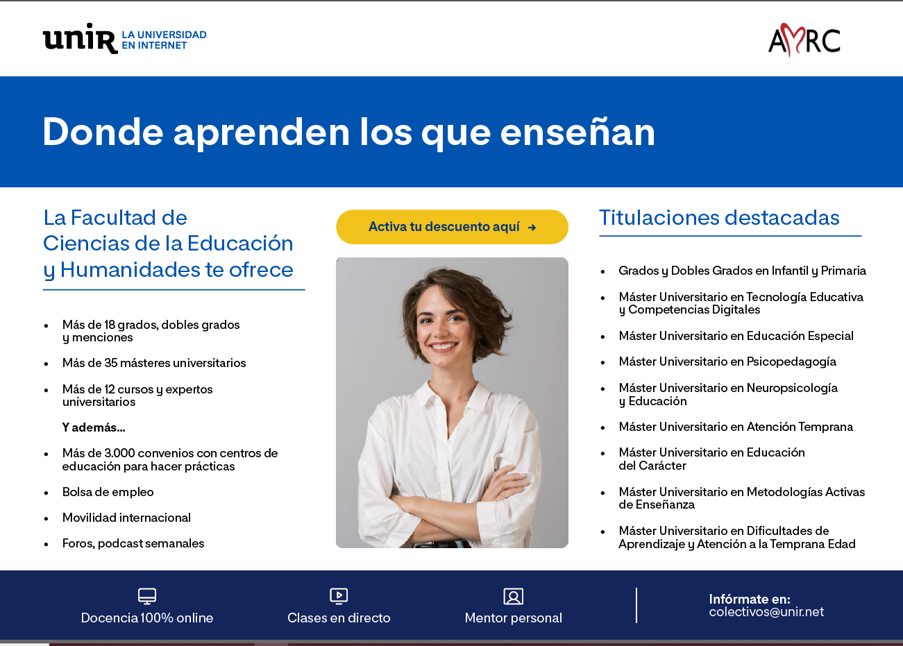 AMRC, amb la UNIR van acordar, ja fa uns cursos, que poguéssiu gaudir d’un descompte mínim garantit del 10% al llarg de tot l’estudi, però que si en el moment de la matrícula hi hagués un descompte més gran al 10%, s’afegirà un 5% al descompte més alt que existeixi. Recordeu que aquestes condicions seran vàlides per als vostres familiars.